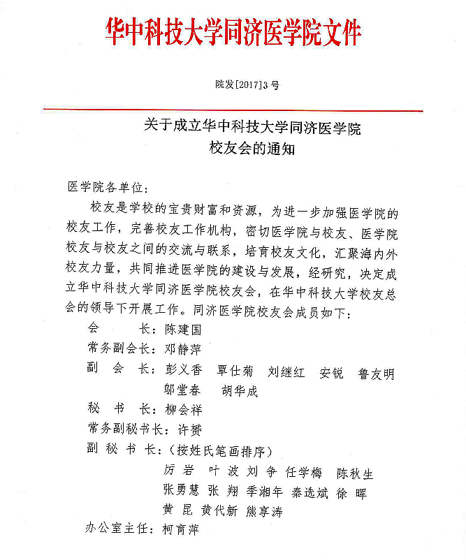 院发[2017]3号 关于成立华中科技大学同济医学院校友会的通知