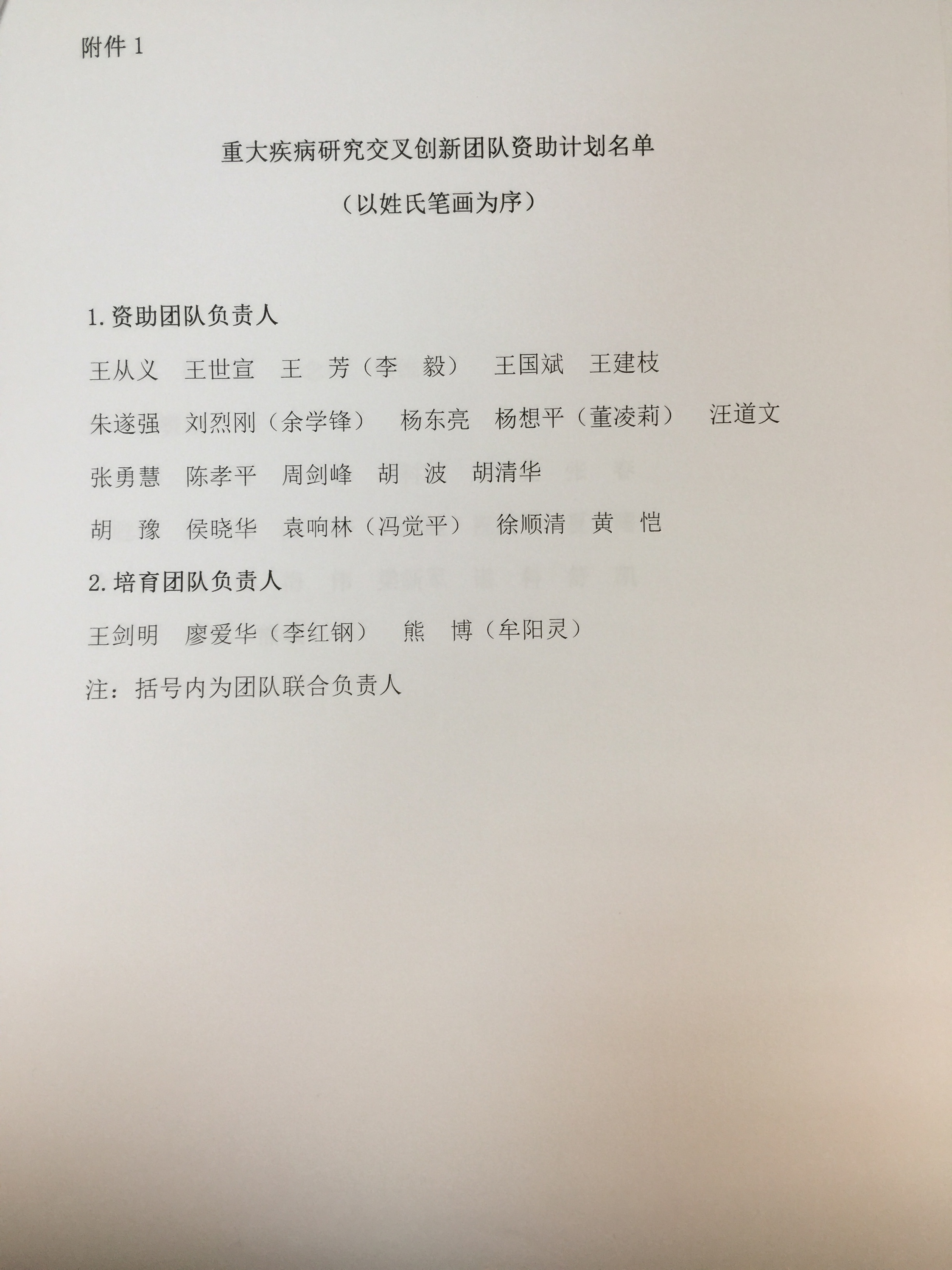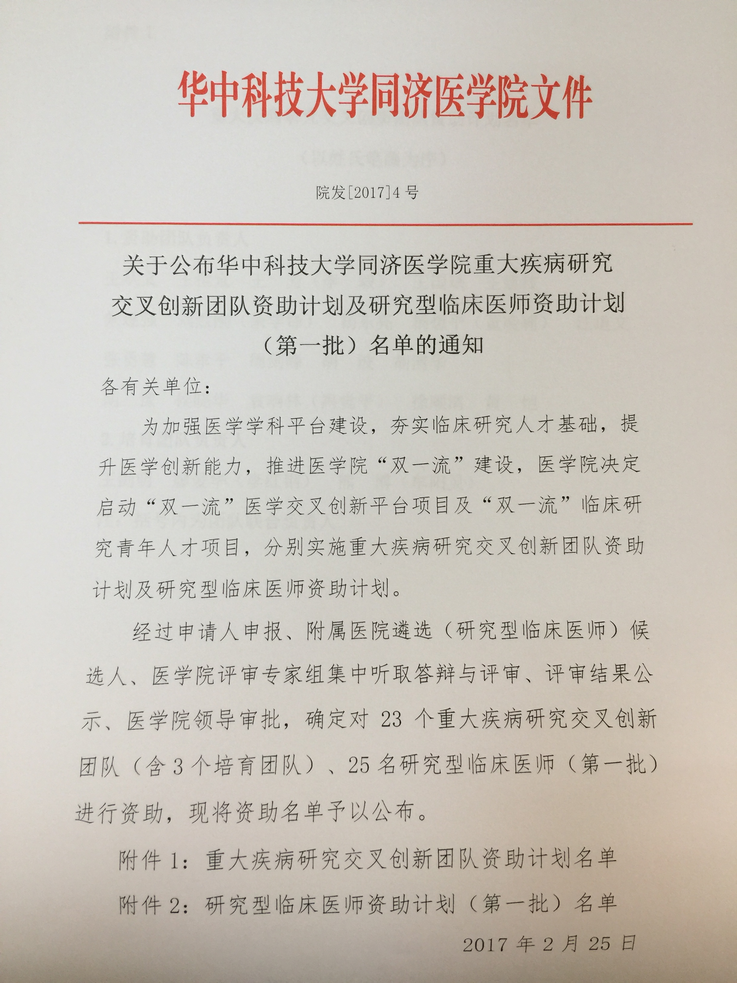 院发[2017]4号 关于公布华中科技大学同济医学院重大疾病研究交叉创新团队资助计划及研究型临床医师资助计划(第一批)名单的通知