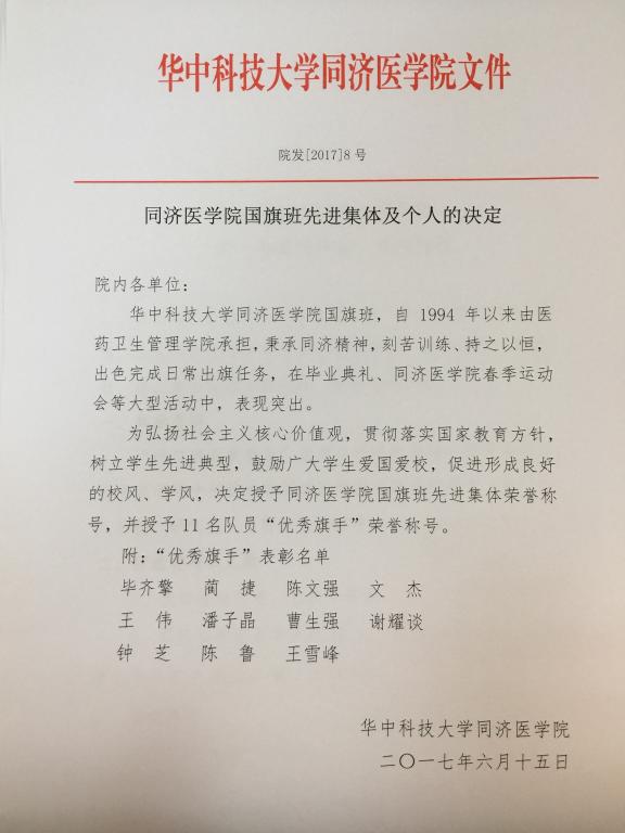院发[2017]8号 同济医学院国旗班先进集体及个人的决定