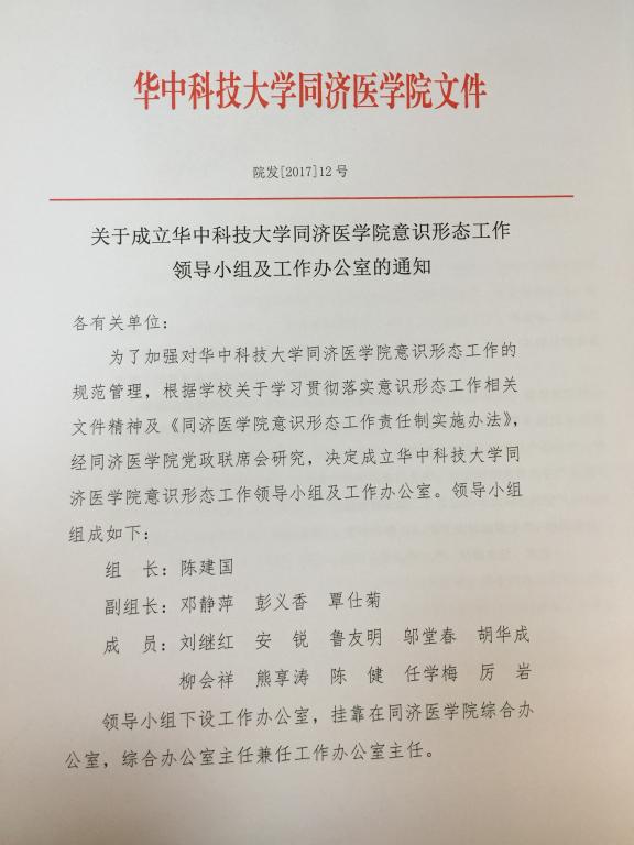 院发[2017]12号 关于成立华中科技大学同济医学院意识形态工作领导小组的通知