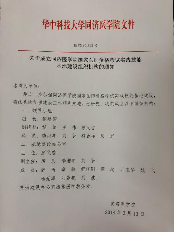 院发[2018]2号 关于成立同济医学院国家医师资格考试实践技能基地建设组织机构的通知