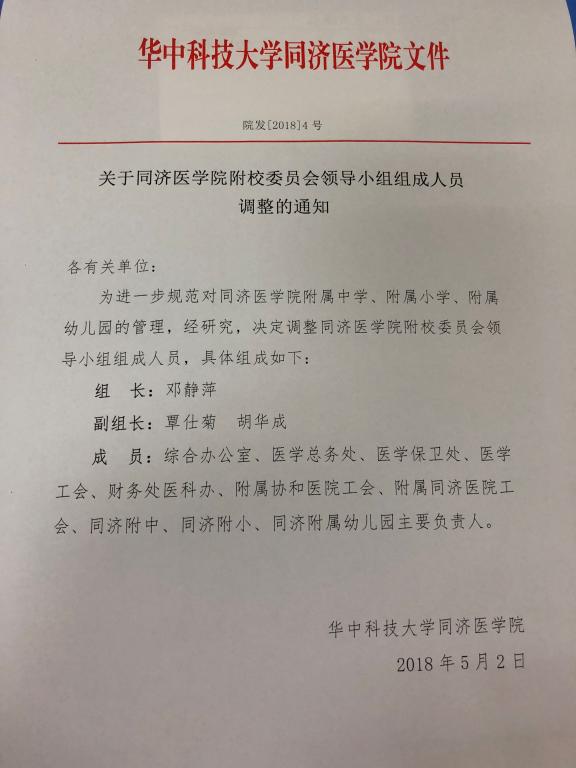 院发[2018]4号 关于同济医学院附校委员会领导小组组成人员调整的通知