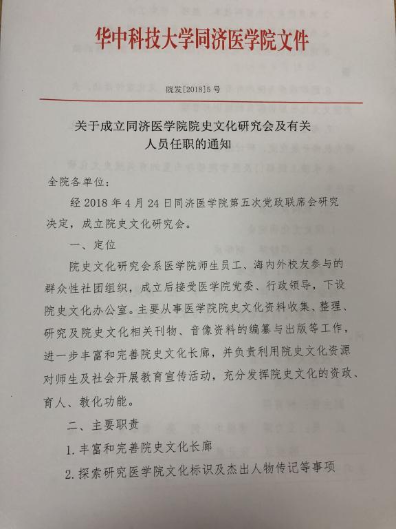 院发[2018]5号 关于成立同济医学院院史文化研究会及有关人员任职的通知